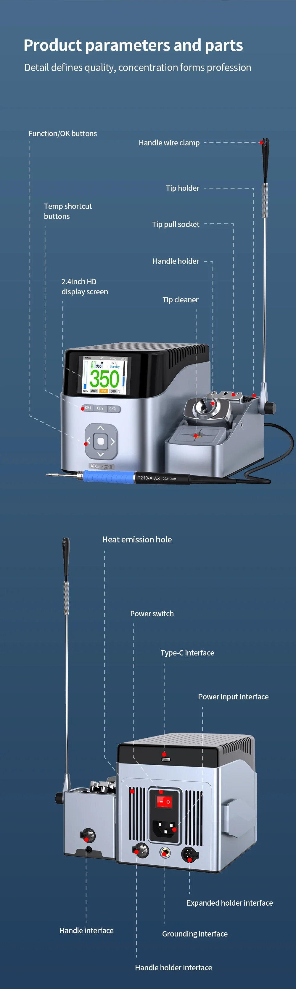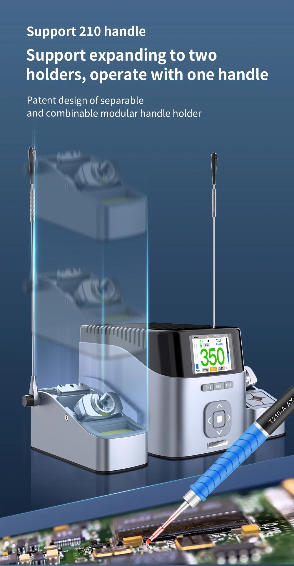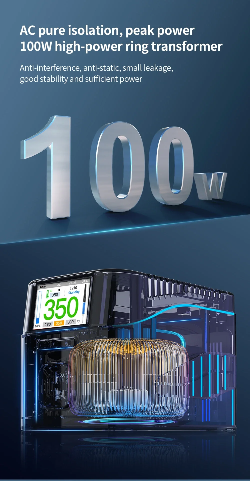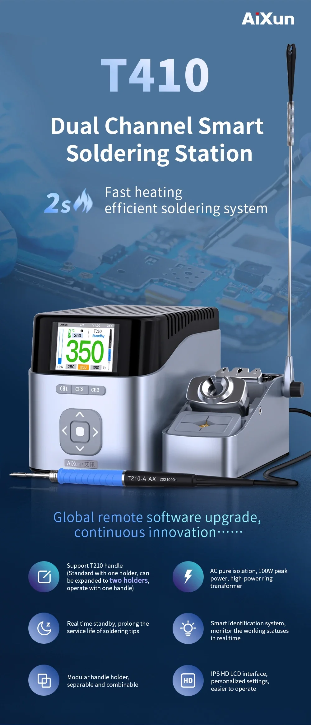 AiXun T410 single channel smart soldering station is a new high efficiency welding station with the intelligent temperature control system which is benefit for prolonging the service of welding iron tips. It is designed with IPS HD LCD interface, supports personalized settings, and is easier to operate. It is equipped with the 100W super high power ring transformer, with which the temperature is able to heating up to 380℃ only in 2 seconds. It supports T210 handle, which can help meet the requirement of soldering precise electronics, such as PCB, BGA, SMT, CPU and mainboard reballing. Like other AiXun products, it also supports global software upgrade, help you enjoy the latest functions and never out of date. It’s a worth- buying soldering station and a necessary tool for mobile rework.