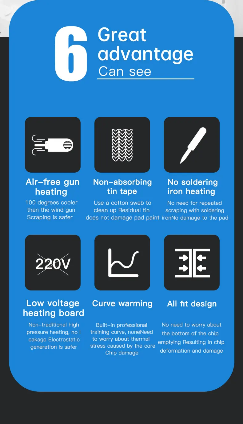 • Heating without a hot air gun, the temperature is 100 degrees lower than that of a hot air gun, making glue or tin removal safer.