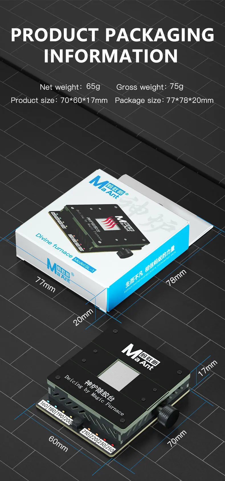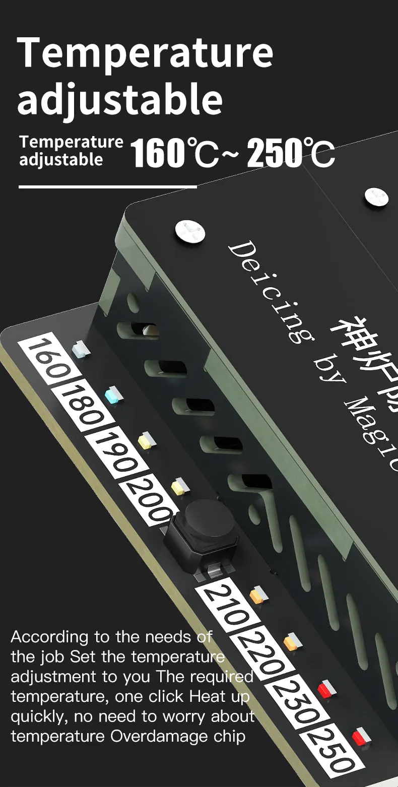 • One-button heating, rapid heating, adjustable temperature range of 160-250°C, suitable for the removal of glue and tin from multiple generations of iPhones and Huawei chips.