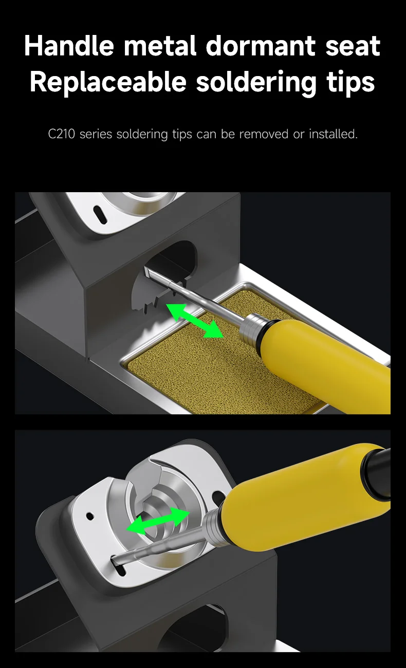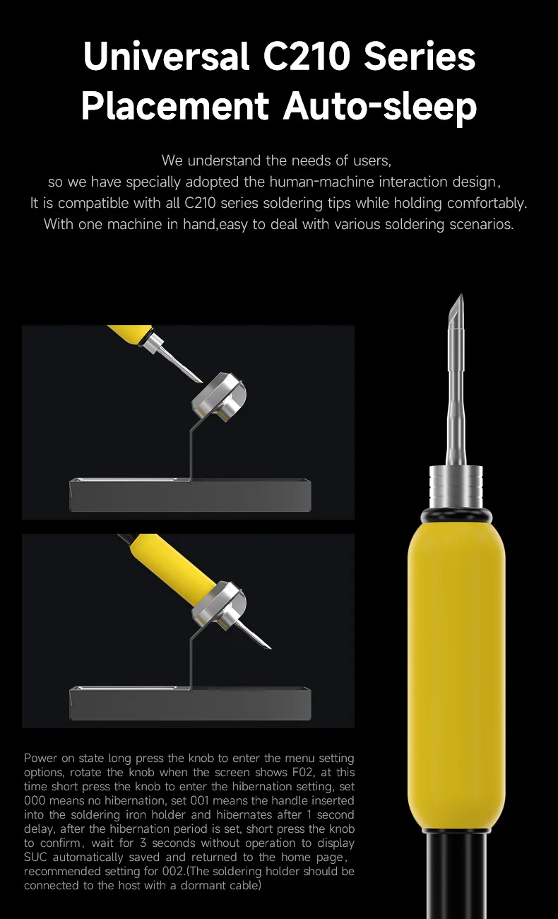 - Universal C210 series, placement auto-sleep, adopted the human-machine interaction design, it is compatible with all C210 series soldering tips while holding comfortably, with one machine in hand, easy to deal with various soldering scenarios