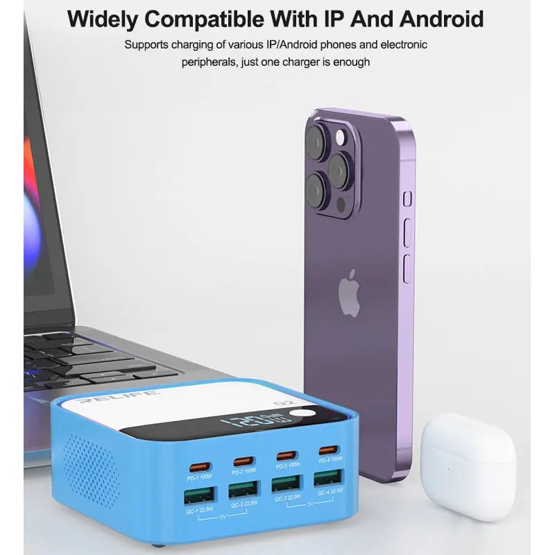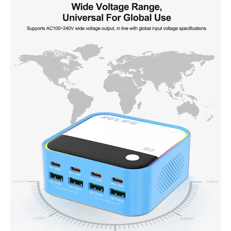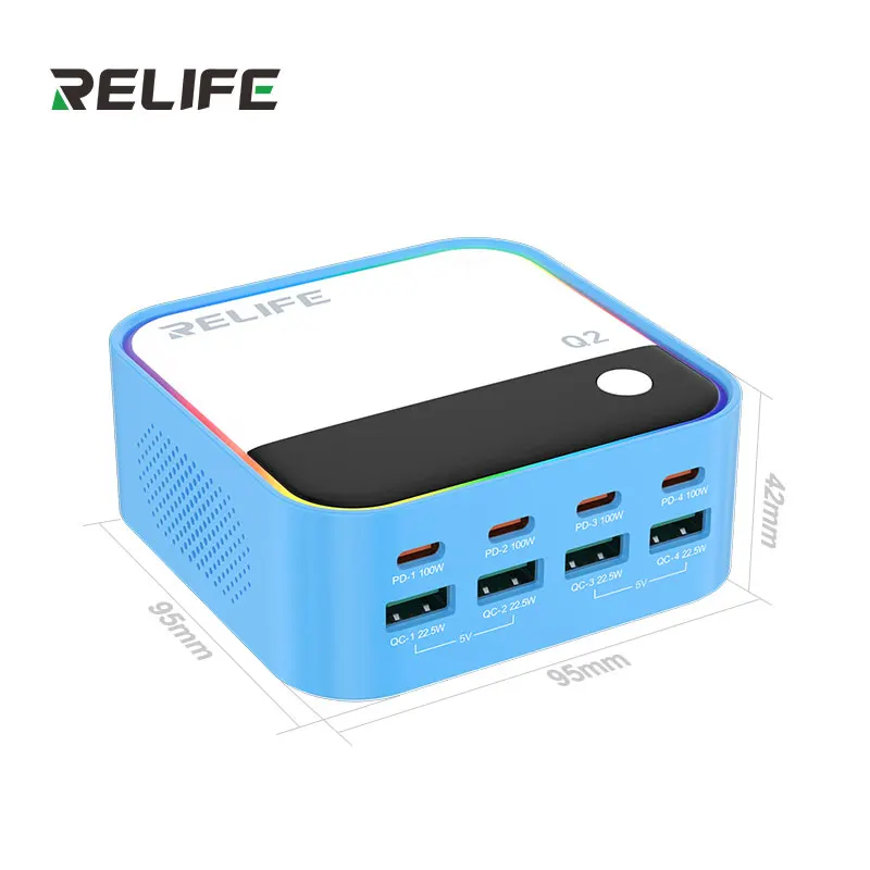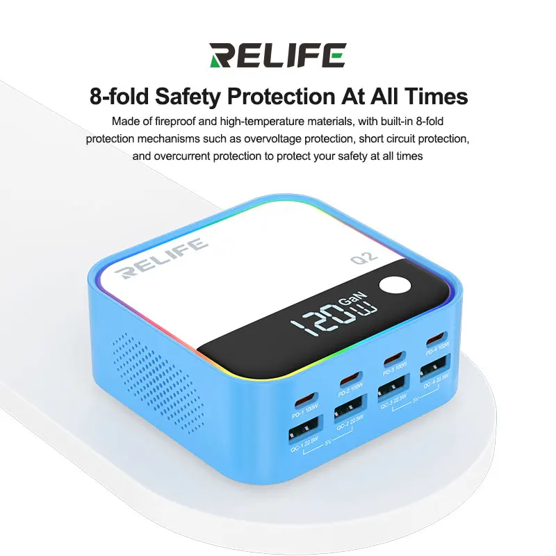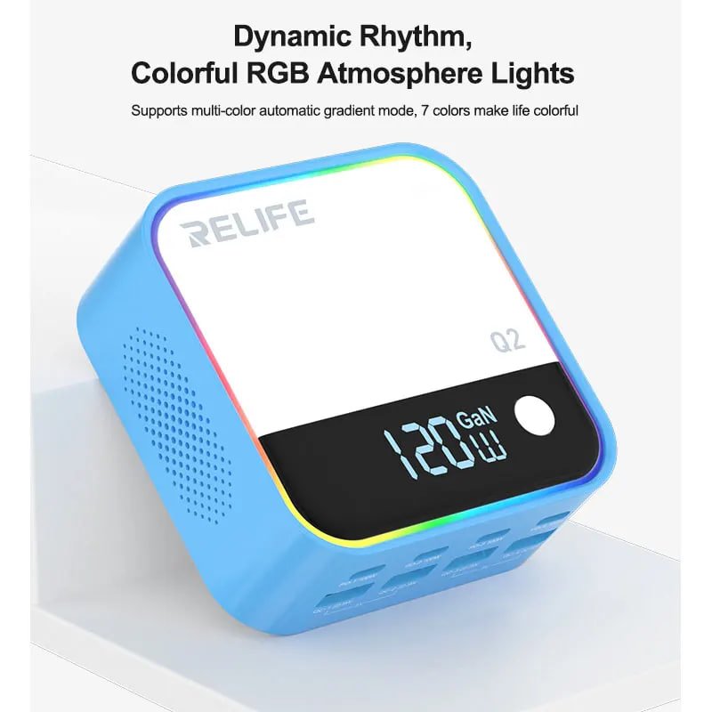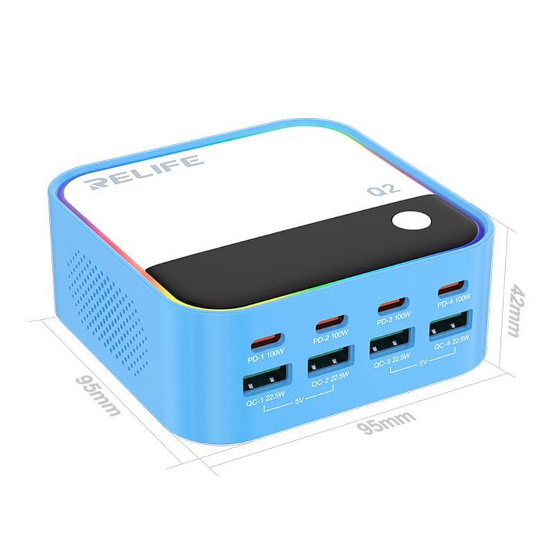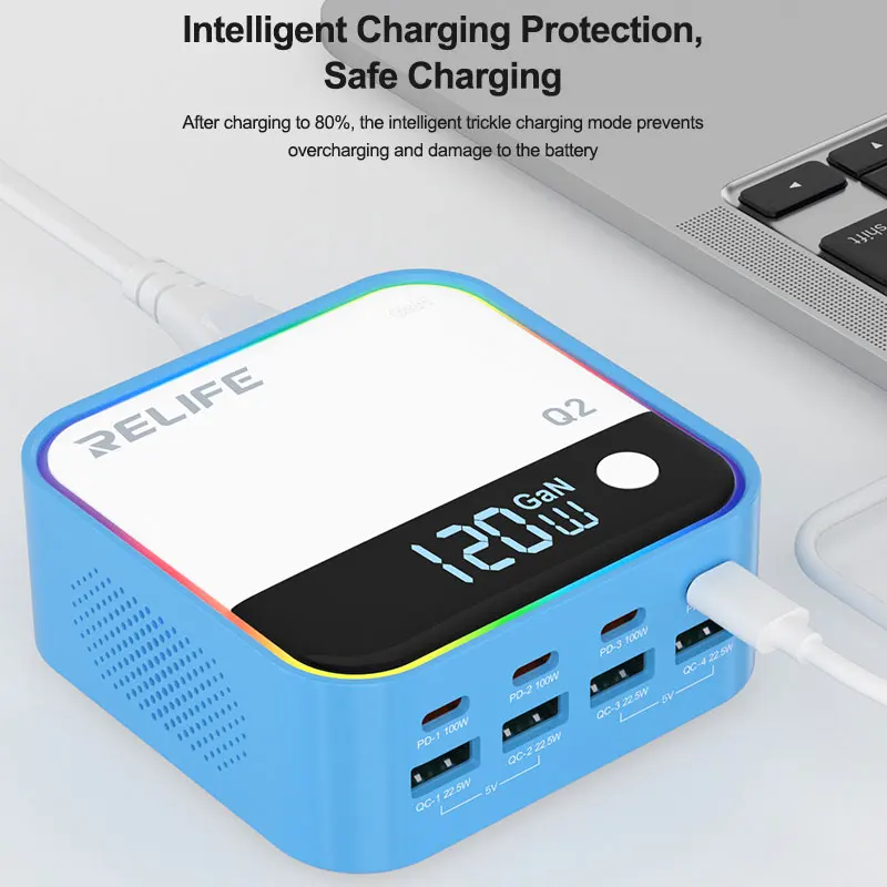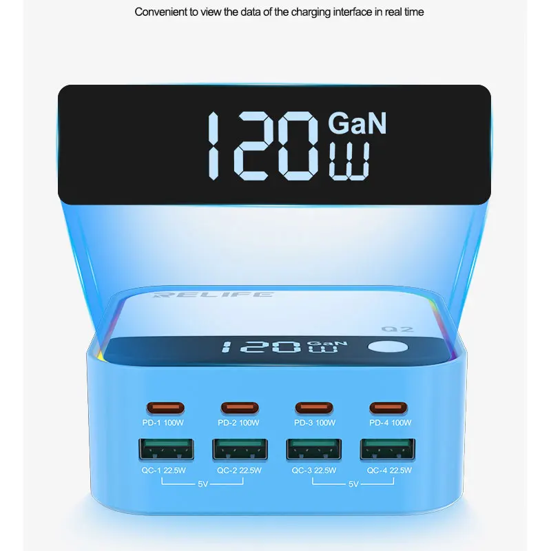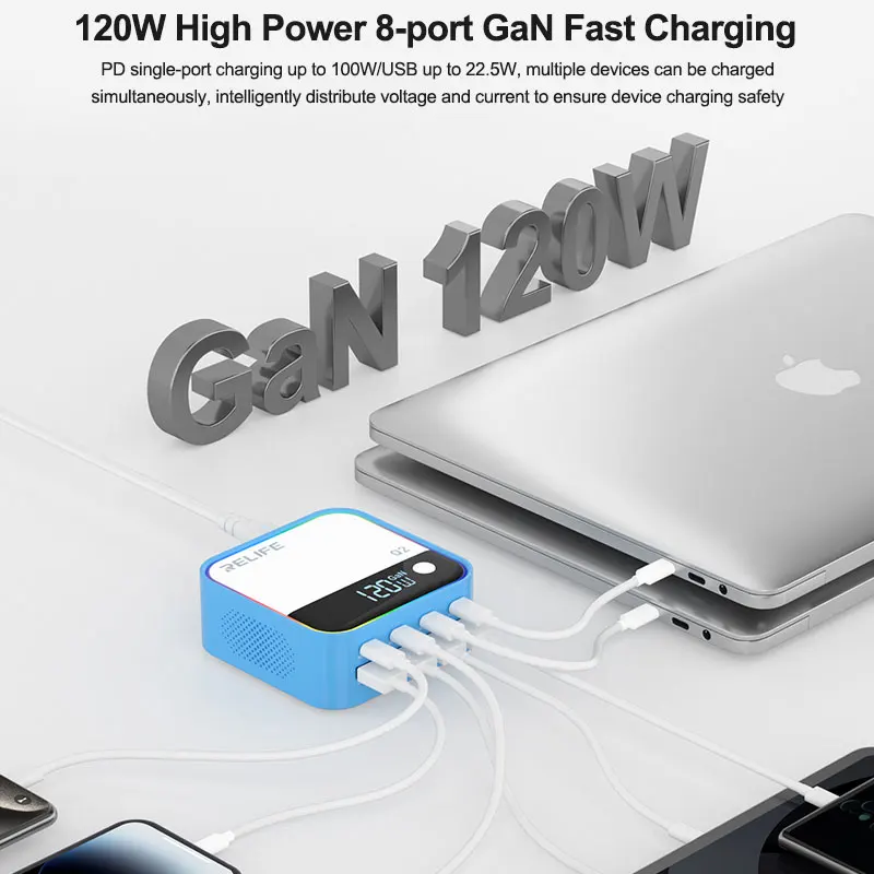 - Relife Q2 120W GaN desktop charger, universal for mobile phones and laptops, 100W PD fast charging, RGB multi-color ambient light, 8-port fast charging