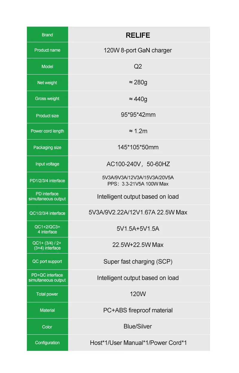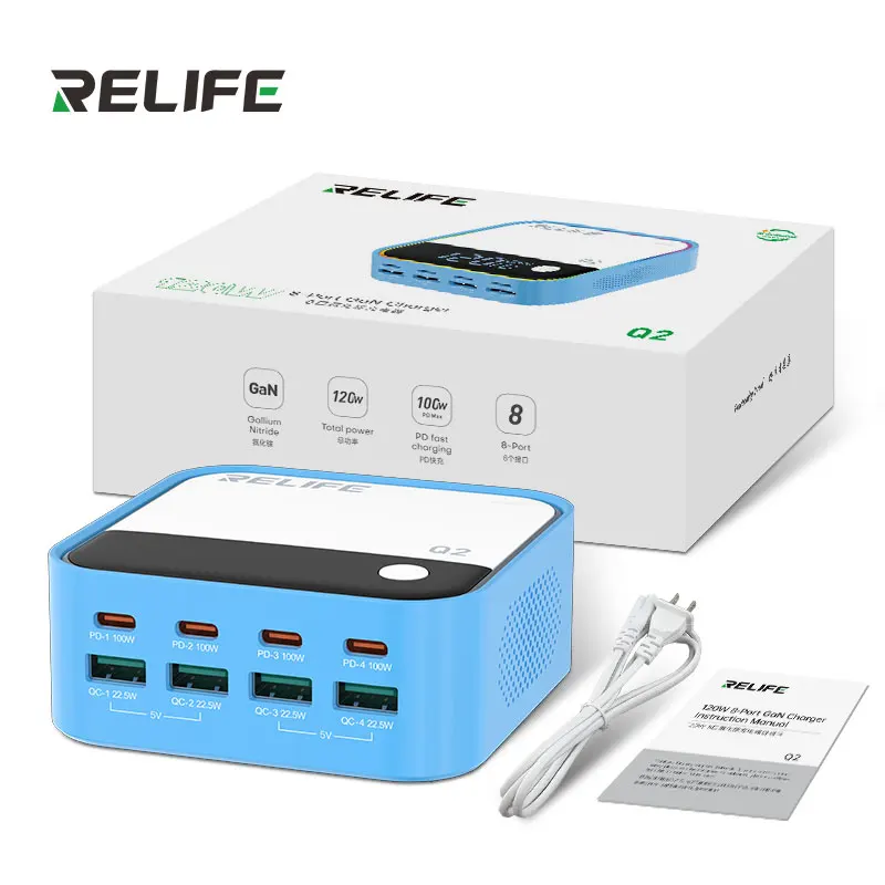 RELIFE Q2 120W GaN Charger 8-port Fast Charging ,100W PD Fast Charging, Intelligent Charging Protection for IP and Android