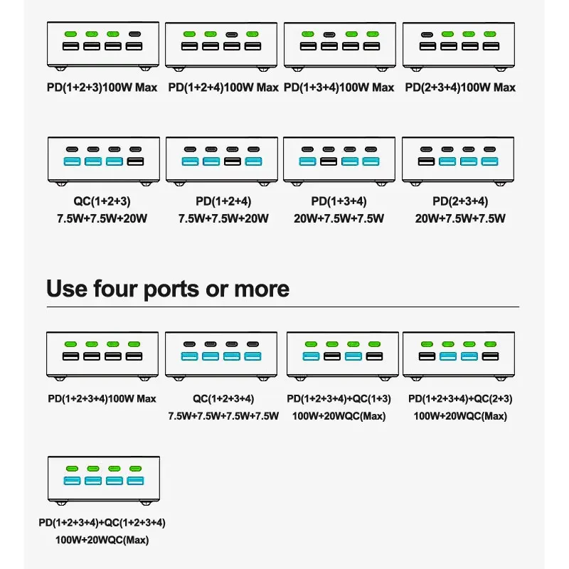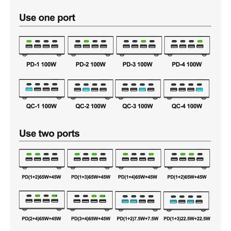 - 120W High Power 8-port GaN Fast Charging: PD single-port charging up to 100W/USB up to 22.5W, multiple devices can be charged simultaneously, intelligently distribute voltage and current to ensure device charging safety
