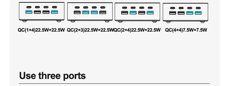 - QC1/2/3/4 interface: 5V/3A, 9V/2.22A, 12V/1.67A, 22.5W Max