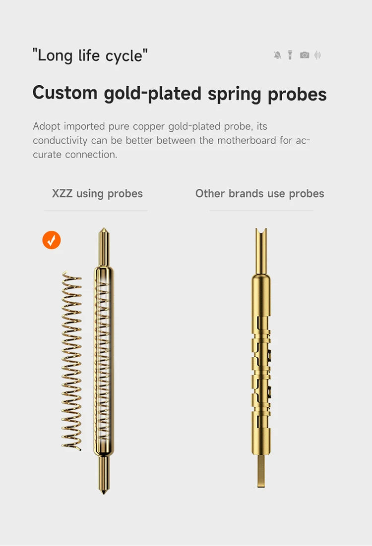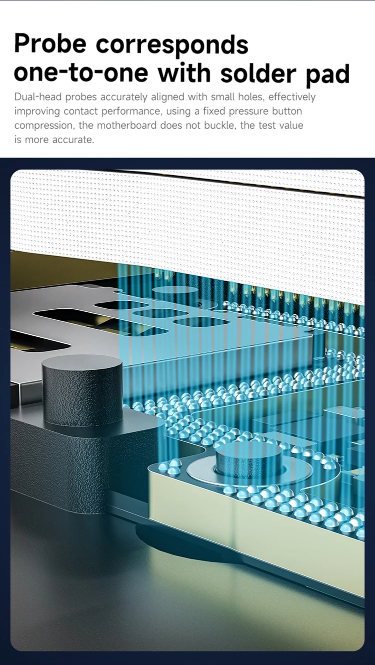 3. It solves the problem of repeated lamination and delamination during motherboard repair. The frame is equipped with imported pure copper gold-plated spring probes to enhance conductivity and stability, suitable for precise testing before installation.