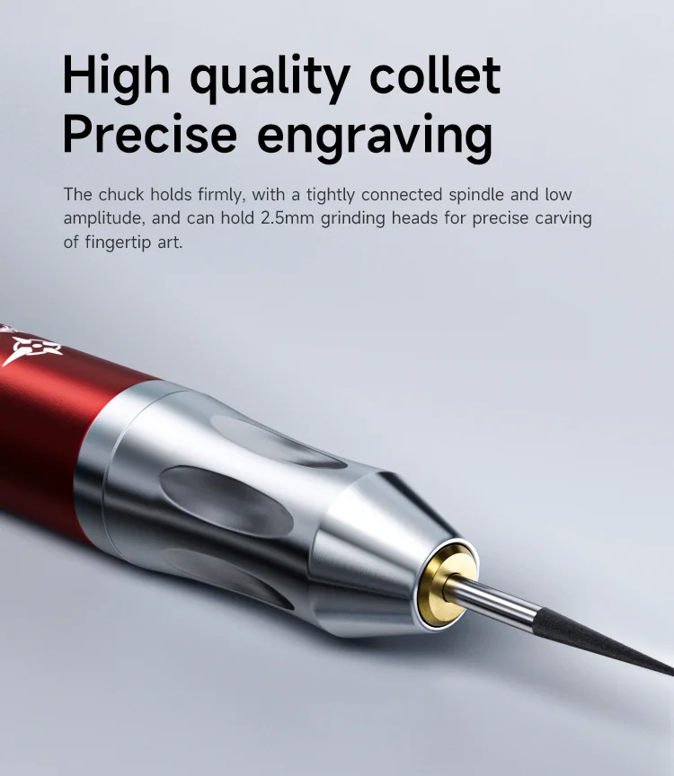High Quality Collet: Precise engraving. The chuck holds firmly, with a tightly connected spindle and low amplitude, and can hold 2.5mm grinding heads for precise carving of fingertip art.