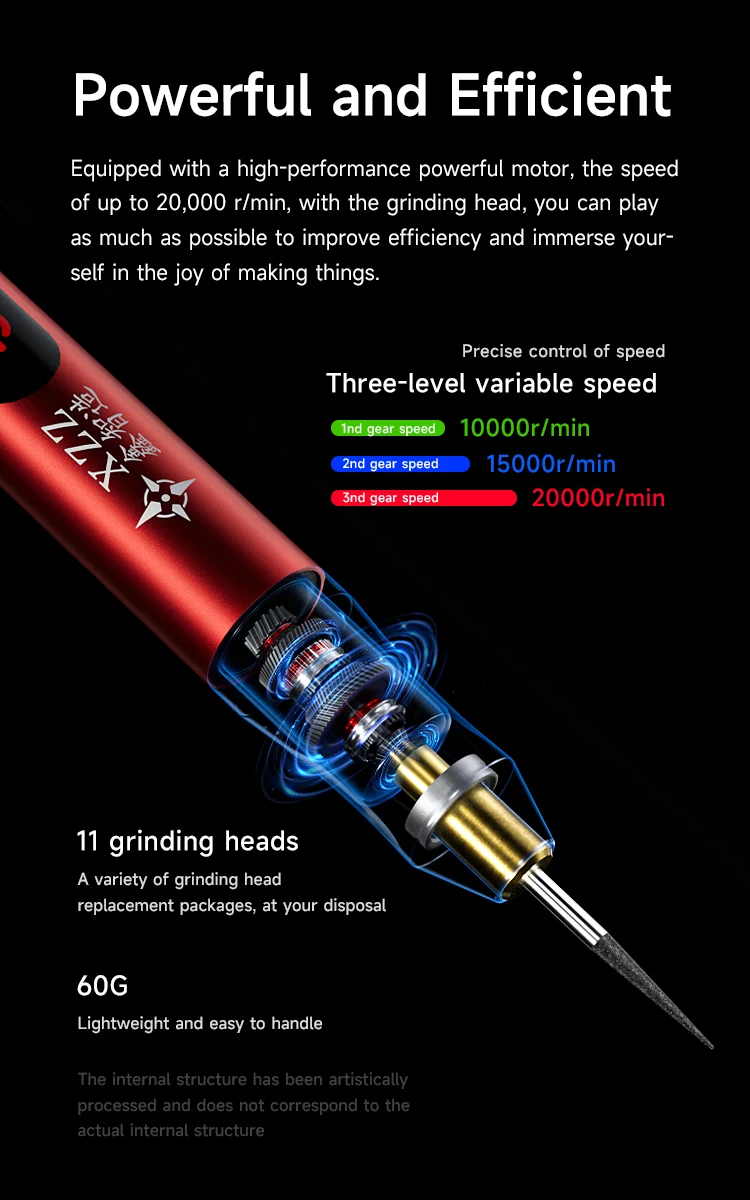 Powerful and Efficient: Equipped with a high-performance powerful motor, the speed of up to 20,000 r/min, with the grinding head, you can play as much as possible to improve efficiency and immerse yourself in the joy of making things.